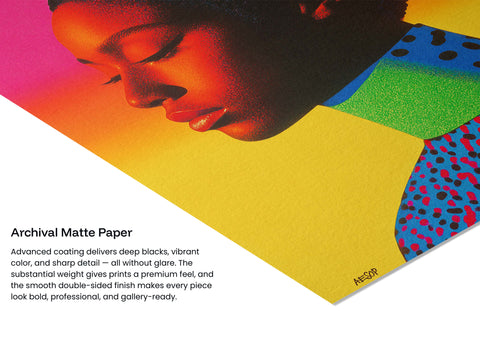 Printed on 300gsm Cold Press Fine Art Paper — heavyweight, acid-free, and textured for a finish that feels as considered as the work itself. Archival pigment inks deliver deep blacks and saturated color that hold up over time.